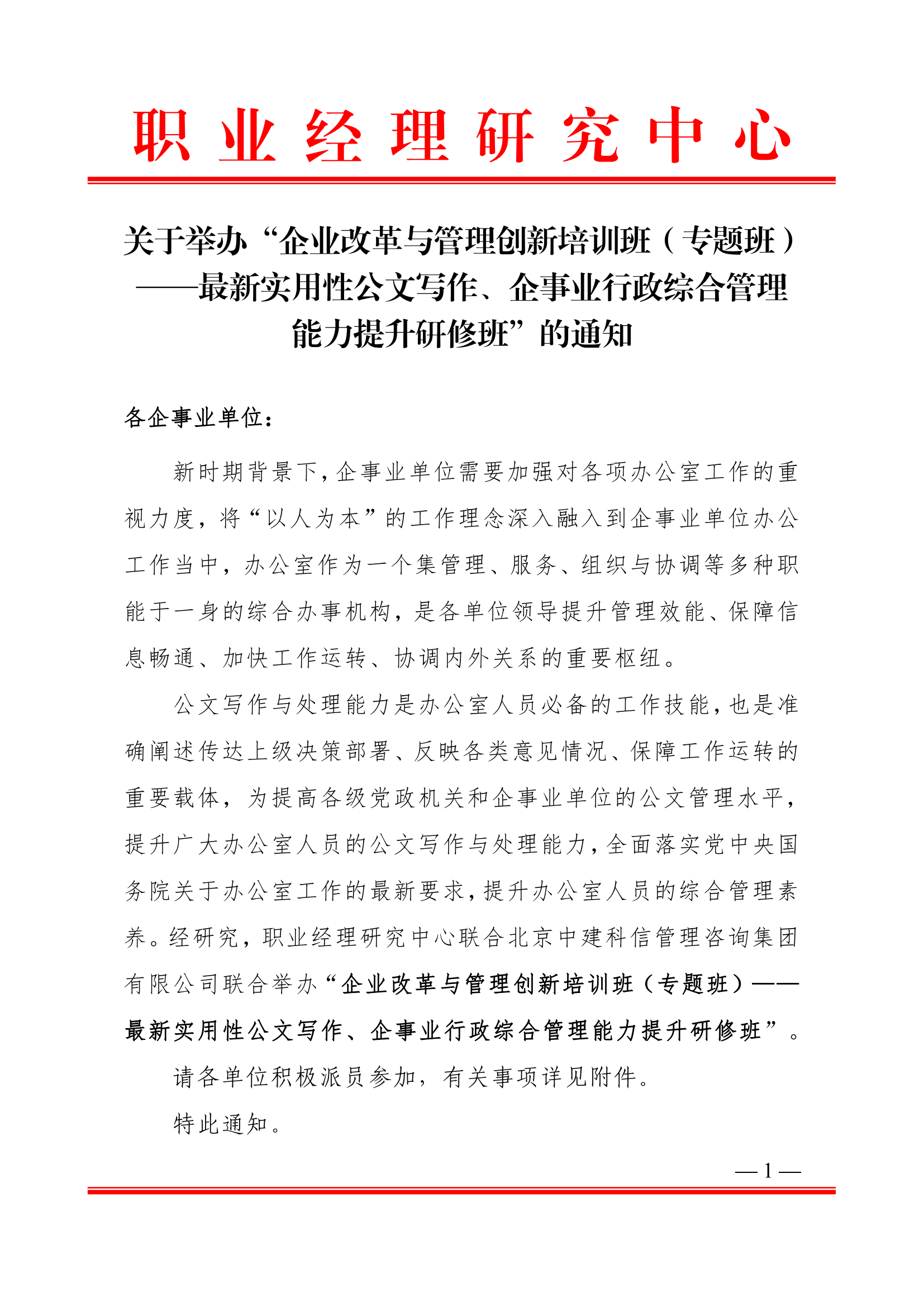 企业改革与管理创新培训班(专题班)——最新实用性公文写作、企事业行政综合管理能力提升研修班招生简章